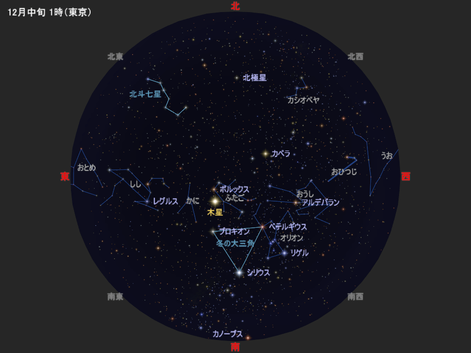 図は12月中旬の深夜1時ごろの星空です。来年1月中旬の深夜23時ごろ、2月中旬の夜21時ごろにも、この星空と同じ星の配置になります(惑星は少し動きます)。