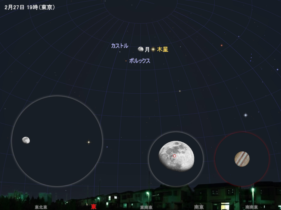 2月27日 19時の東の空の様子(場所の設定は東京)。接近の様子はほぼ一晩中見られるが、時間によって方位や高さは変化する。大きい円は拡大イメージ(視野6度)、小さい円はさらに拡大のイメージ(正立像)で、月の拡大像の中にある赤い円の大きさが、木星の拡大像の円と同じ