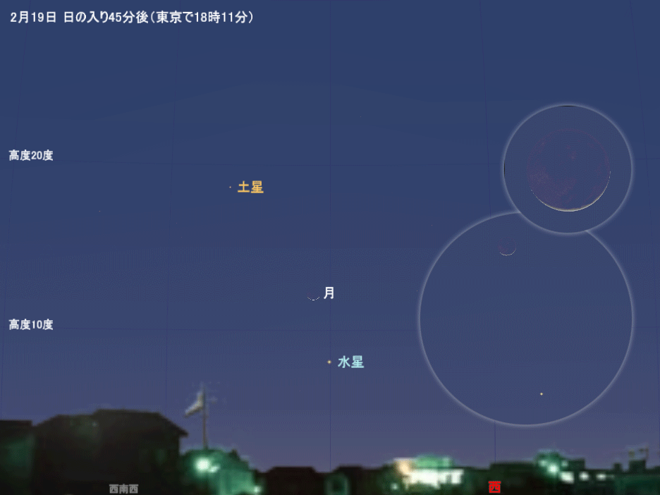 水星は明るいため肉眼でも見えますが、太陽が沈んでから間もないので空も明るく、水星の光が埋もれてしまって見づらいかもしれません。まず双眼鏡を使って探すと良いでしょう。スマートフォンの星図アプリなどを使って水星の位置を調べ、双眼鏡で丁寧に探してみてください。19日には三日月と並び、美しい光景が楽しめます。