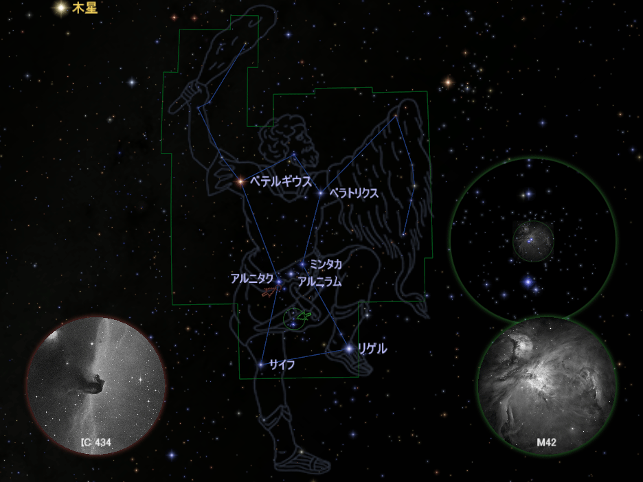 また、三ツ星の東(左)にある「馬頭星雲IC 434」も有名です(ICもカタログの符号です)。眼視ではわかりませんが、撮影するとその名のとおり馬の顔や首のような形がとらえられます。星図の画像を90度、反時計回りに回転させるとわかりやすいでしょう。