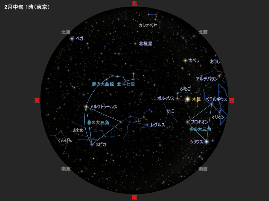 図は2月中旬の深夜1時ごろの星空です。3月中旬の深夜23時ごろ、4月中旬の夜21時ごろにも、この星空と同じ星の配置になります(惑星は少し動きます)。
