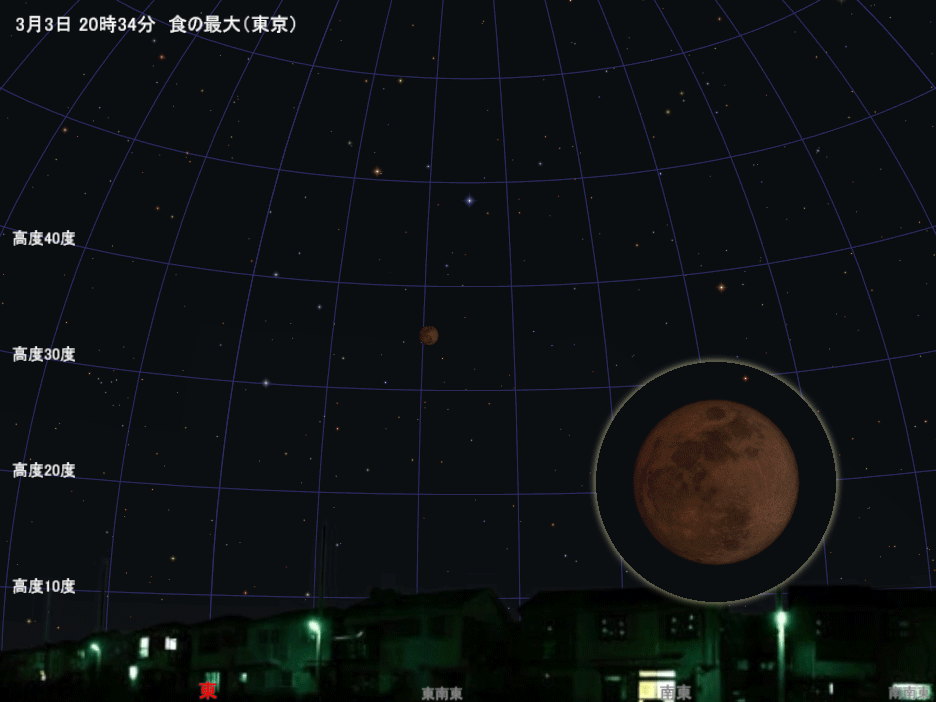 月が欠け始める(部分食の始まり)のは18時50分ごろで、東の低空に見える満月の左下から暗くなっていきます。その後、月は高く昇っていきながらどんどんと欠けていき、20時5分ごろに月全体が地球の影に入ってしまう「皆既食」の状態になります。