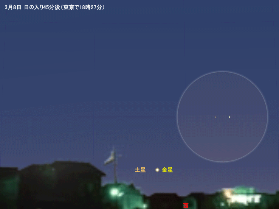 月初めから10日ごろまで、この金星の近くに土星も見えています。空が暗ければ(夕空でなければ)土星も肉眼で簡単に見えますが、日の入りから30分ほどしか経っていない空の中、しかも低いところにあると、すぐには見つかりません。まず金星を見つけてから、その方向に双眼鏡を向けて土星も探してみましょう。