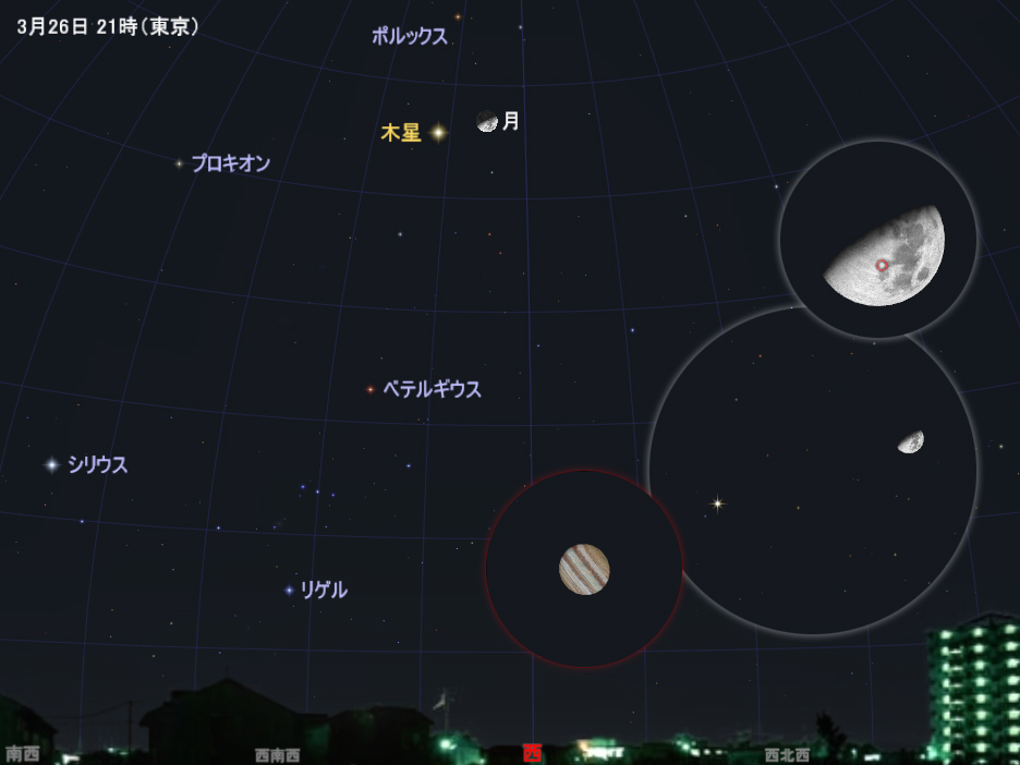 また、26日の夕方から27日の未明にかけては、上弦過ぎの半月と木星が接近して見えます。接近の様子を肉眼や双眼鏡で眺めるだけでなく、それぞれを天体望遠鏡で拡大して月のクレーターや木星の縞模様、ガリレオ衛星の配列なども観察してみましょう。