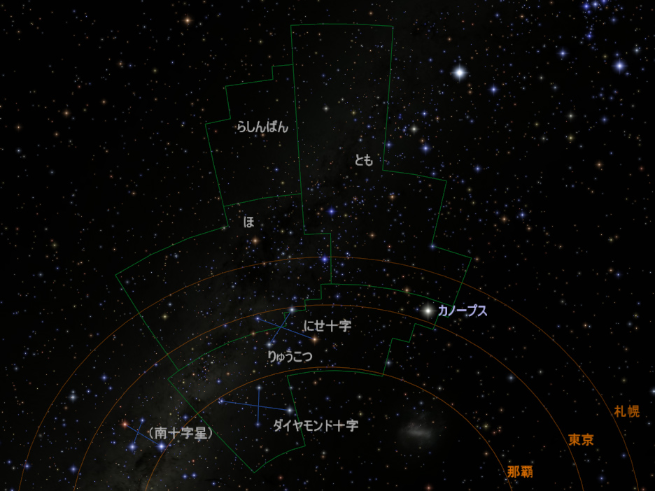 緑の線:各星座の領域(境界線)/オレンジの線:この線より上(北)の星が、札幌・東京・那覇のそれぞれで見られる。札幌では「りゅうこつ座」はまったく見えず、東京ではカノープスがかろうじて見え、那覇では「にせ十字」まで見えるが「ダイヤモンド十字」は見えない