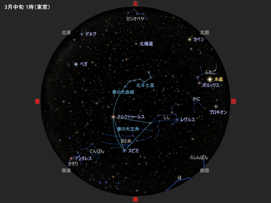 図は3月中旬の深夜1時ごろの星空です。4月中旬の深夜23時ごろ、5月中旬の夜21時ごろにも、この星空と同じ星の配置になります(惑星は少し動きます)。