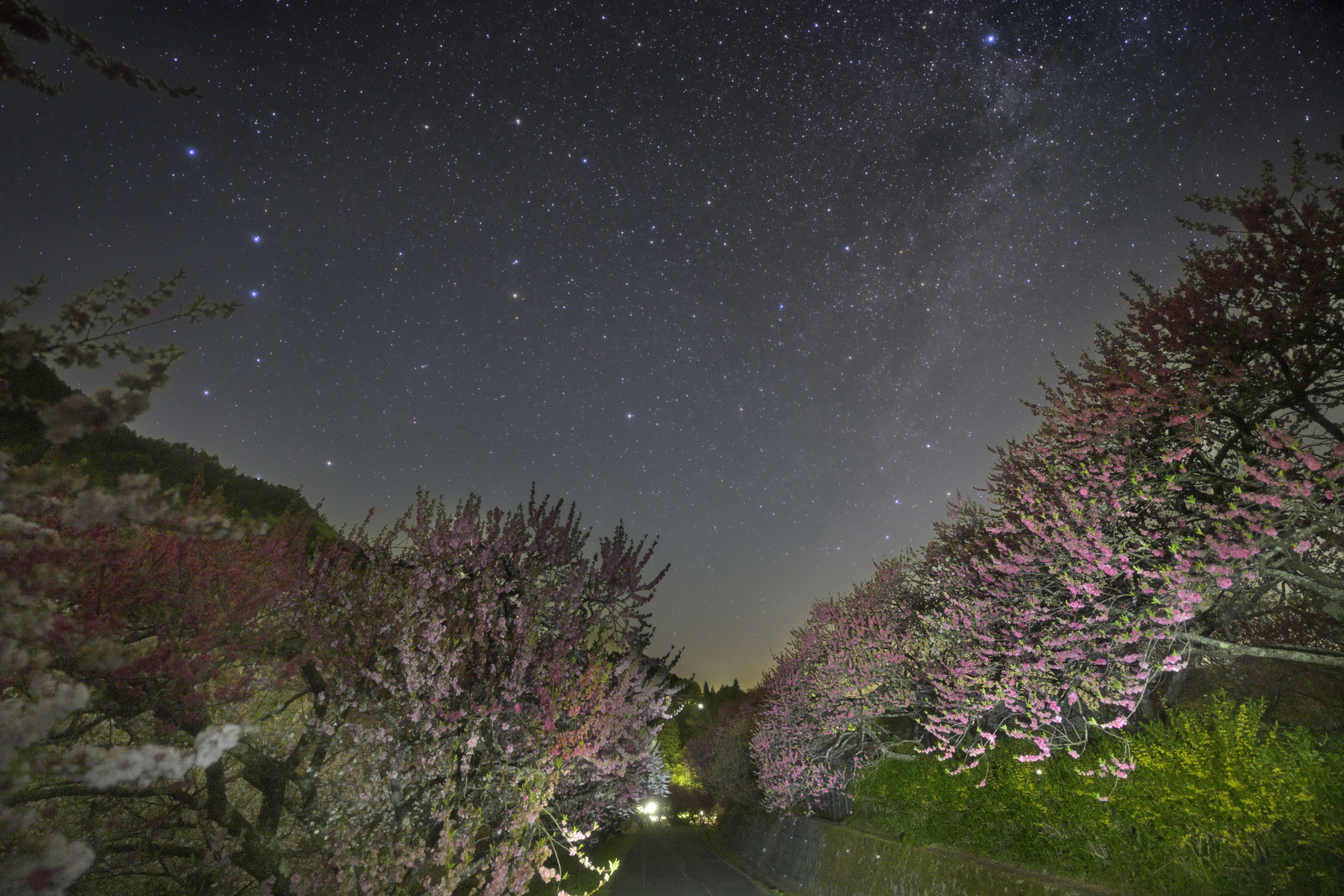 花桃で有名な長野県阿智村「花桃の里」に行ってきました。昼間は大混雑ですが夜も撮影されている方々が大勢いらっしゃいました。山間なので花桃が暗く、なかなか表現しにくいのですが、街灯などを利用してうまく撮影できました。北斗七星とカシオペヤ座、北極星など、北天の空に役者が揃っています。