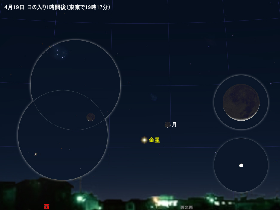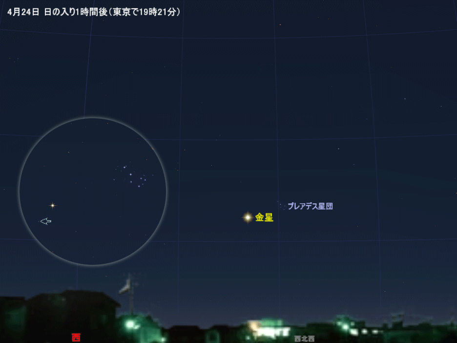 宵の明星の金星は、4月下旬には日の入り1時間後の高度が10度を越えるようになってきます。見やすい高さとは言えませんが、金星はとても明るいので、建物などの陰になっていなければすぐにわかります。