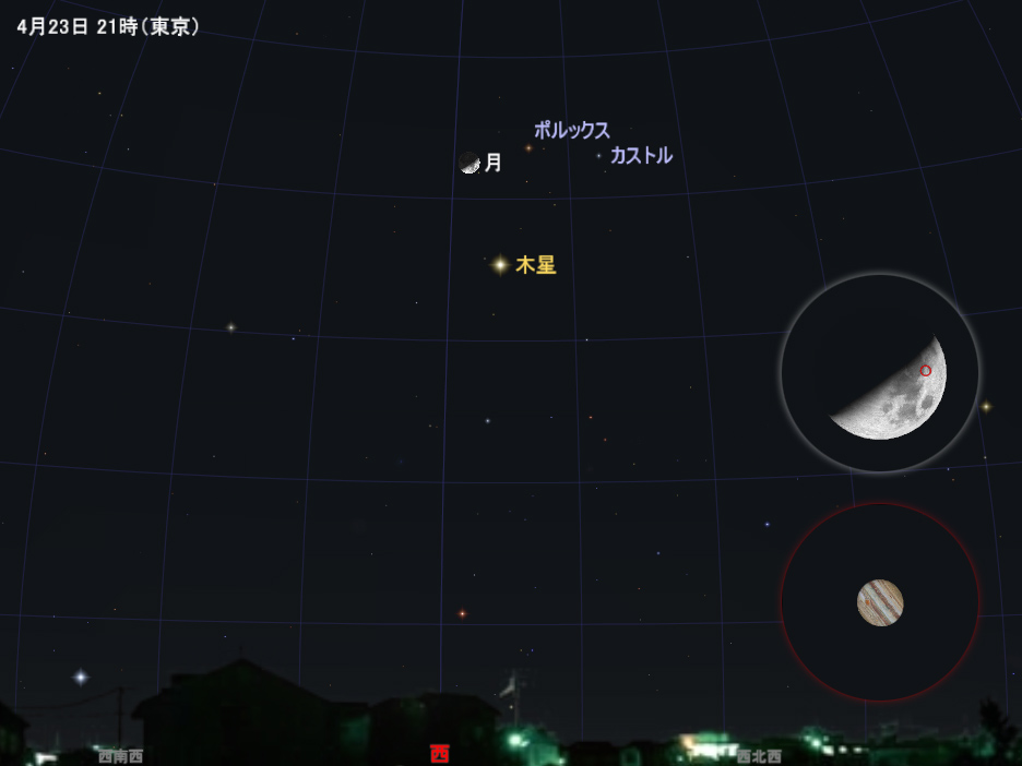 22日の深夜に上弦前のやや細い月(月齢5)と並びます。また、翌23日の夕方から宵にも、少し太くなった月と木星が並びます。機会があれば天体望遠鏡で4つのガリレオ衛星や木星本体の縞模様も観察してみましょう。