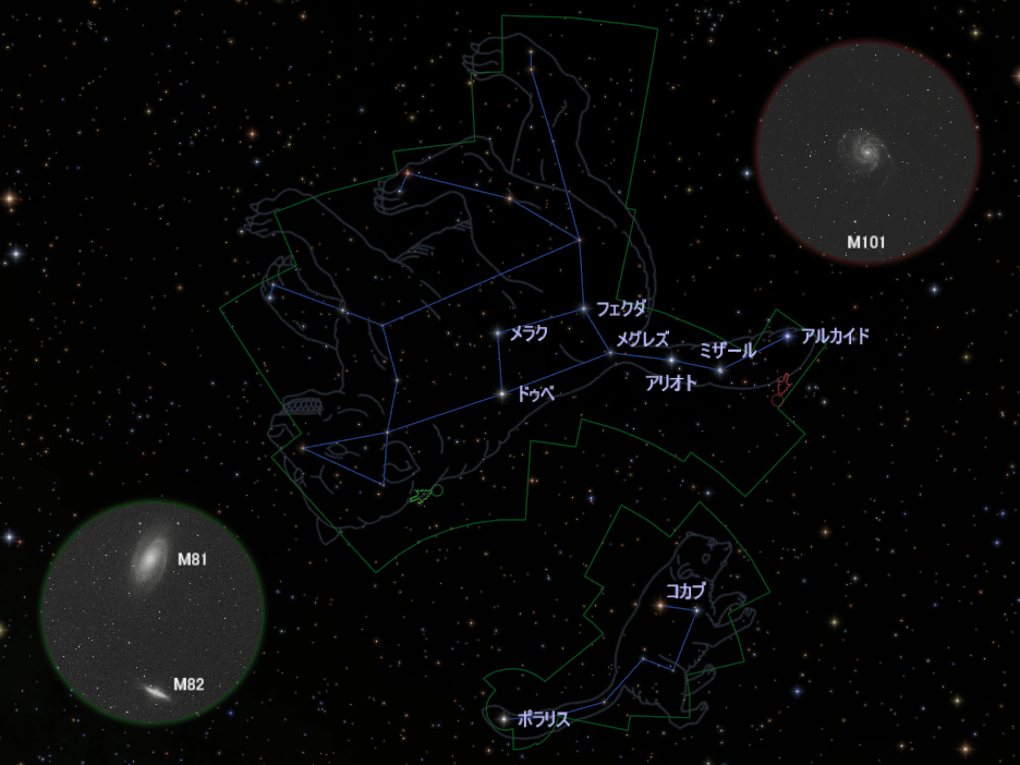 一方、北斗七星の柄の先あたりにはM101という銀河があります。M81と同様に美しい渦巻きが特徴で、「回転花火銀河」という愛称があります。距離はおよそ1900万光年です。これも眼視では渦巻きの細かい様子までは見えませんが、天体写真では人気のターゲットです。