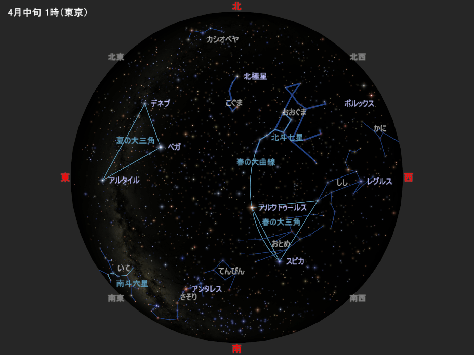 図は4月中旬の深夜1時ごろの星空です。5月中旬の深夜23時ごろ、6月中旬の夜21時ごろにも、この星空と同じ星の配置になります(惑星が見えることもあります)。
