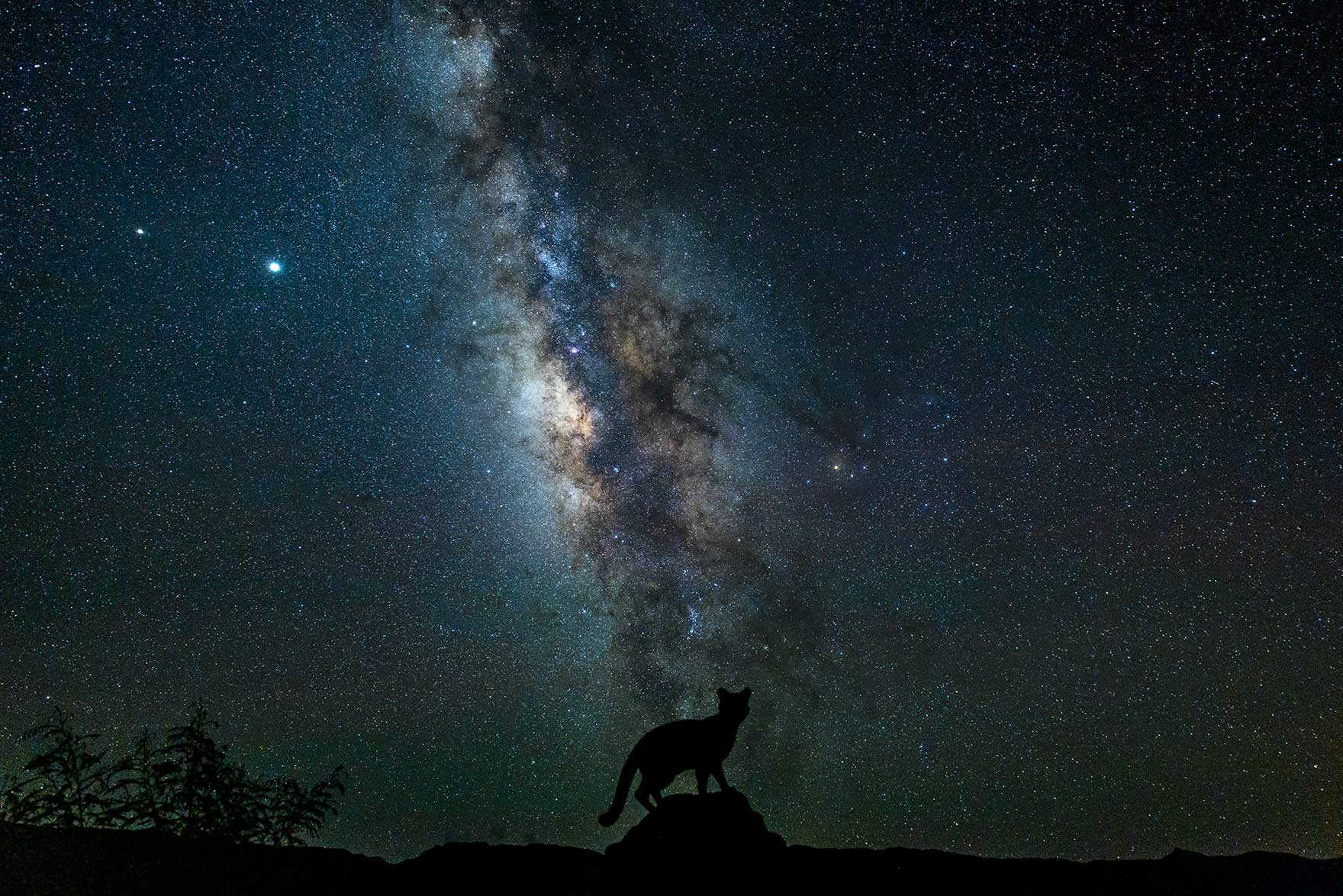 そんな私の前に、満月より難易度の高そうな天の川と猫が出現したのだ。狂喜乱舞するのは仕方なかろう。モデル体型で決めポーズのまま動かないイリオモテヤマネコ像は撮りやすく、周りに誰もいないから撮影位置も選び放題。カメラ2台体制で、ひたすら猫像と対峙し撮り続ける。ただし深夜でも車の往来はたまにあり、車から「この人、何をしているんだろう?」的な停車や視線を感じることも。暗闇になれない目では天の川に気づかないので、「真夜中にイリオモテヤマネコ像の前に座りこむ変な人」。さらには「危ない人」と思われるのか、皆、問いかけもせず走り去っていく。私も背中から「だれにも邪魔されたくない」オーラを全開放出して、車が止まろうが人が歩こうが振り向きもせず、この神秘的なコラボの秘密を守り抜いた。意地が悪かったかな?
