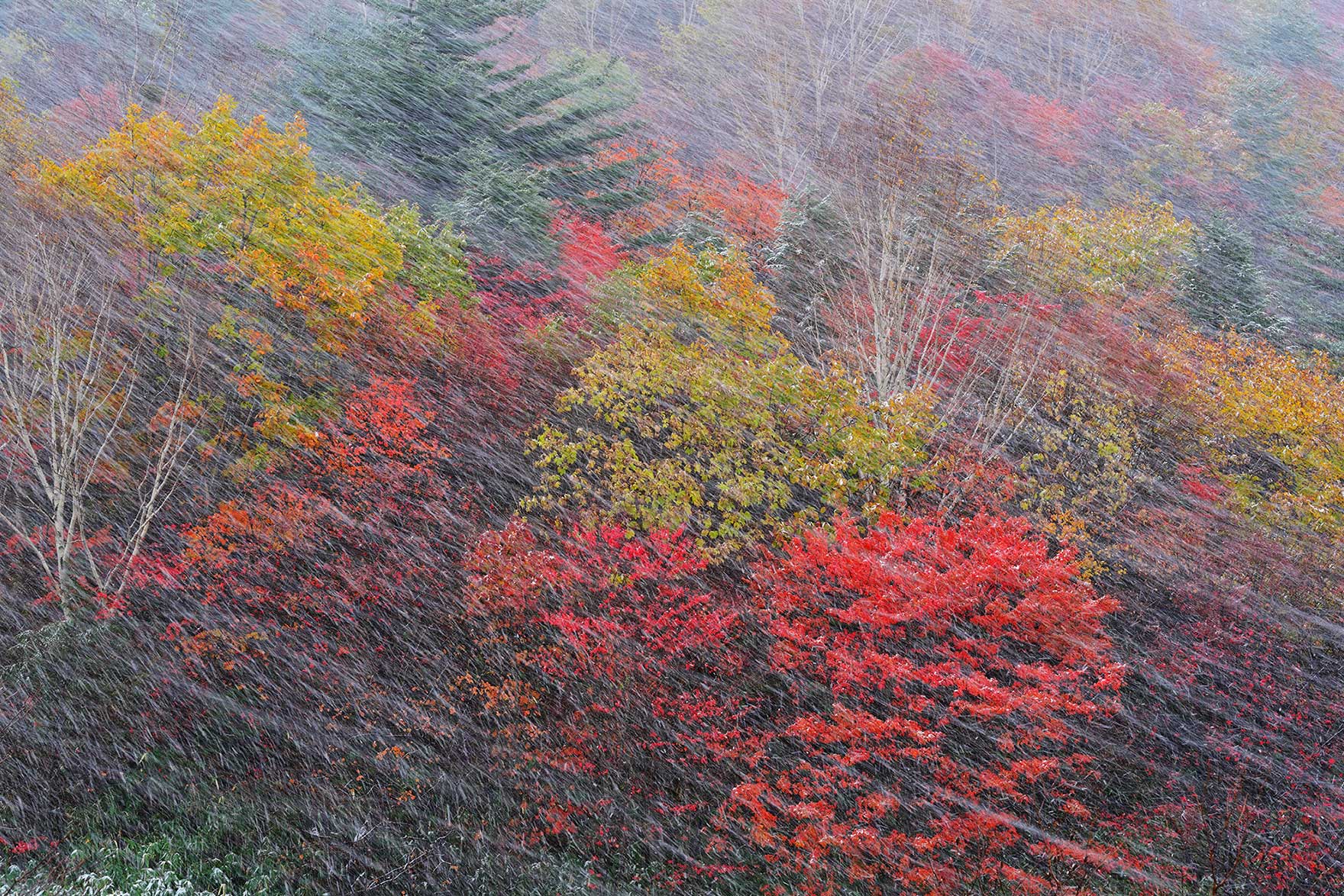 紅葉を飾る細雪は次第に大粒の雪となり、どんどん降り続ける。雪玉を撮るチャンスだ! 興奮しながら高速シャッターで撮影するうち、スローシャッターで雪を流せるほど吹雪いてきた。