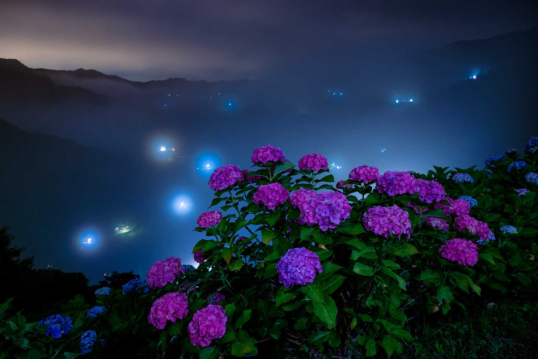 紫陽花の背景に雨上がりの雲海が踊り、曇り空から青空に移りゆくドラマを、私はヤキモキしながら撮り続けた。