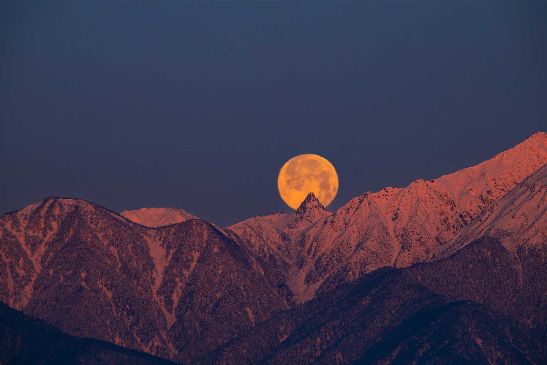 そして昨冬、私はついに山の頂に沈む満月という望遠レンズの世界を初経験した。