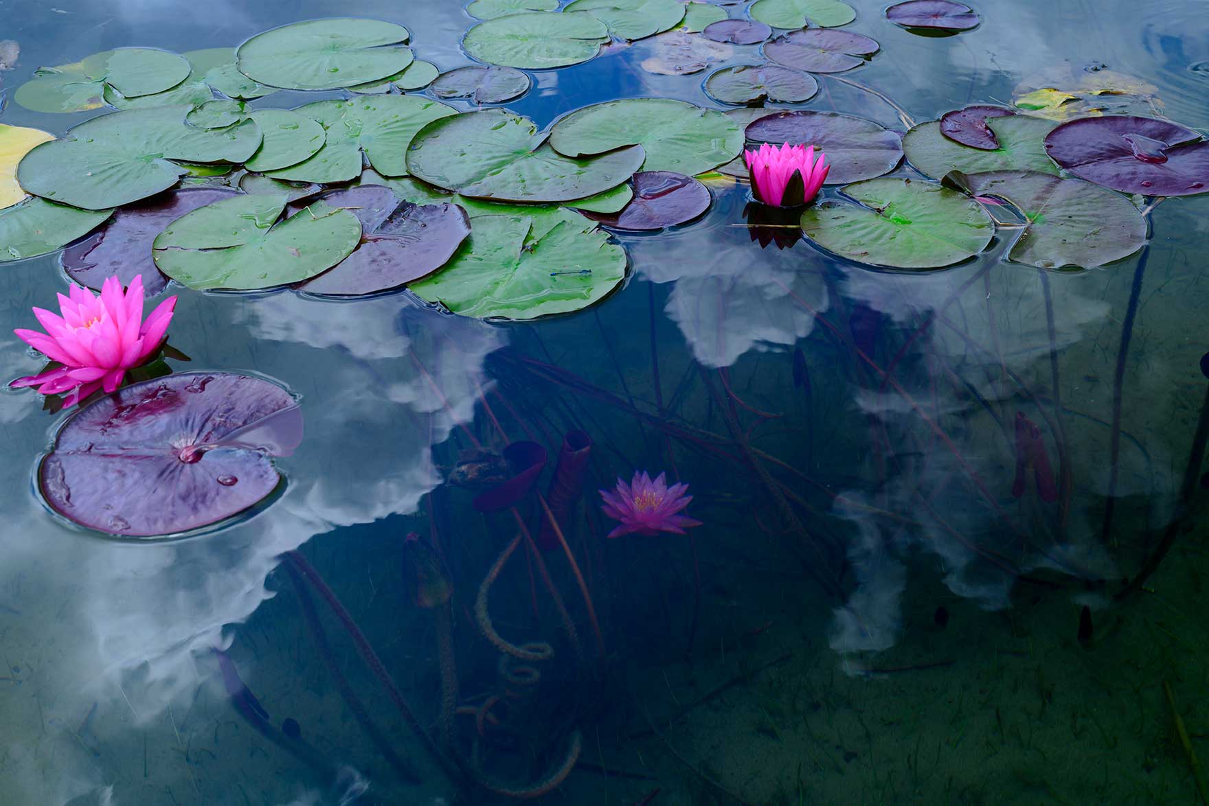PLフィルターをクルクル回し、水面を暗く落として水中の花を目立たせつつ、白い雲を映し込む。雲もどんどん形を変えながら流れて行くので忙しい。