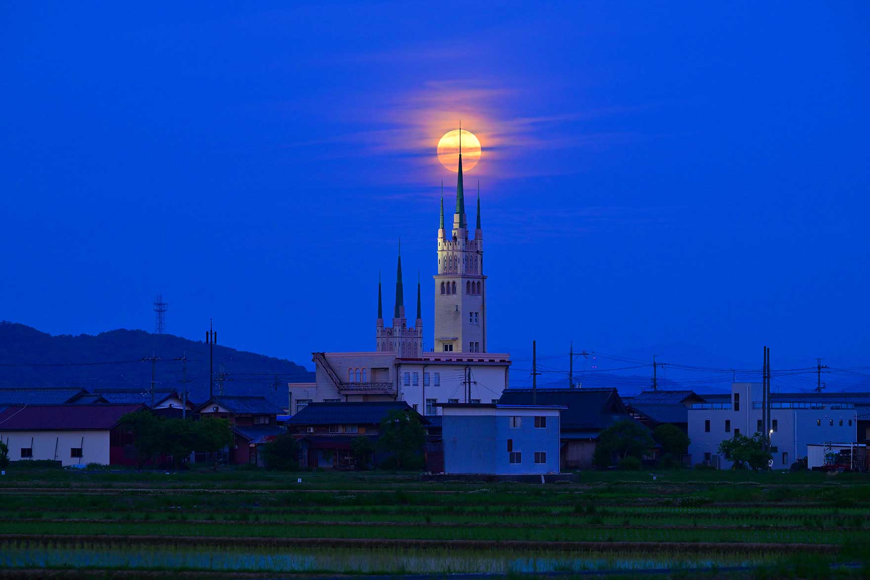 ヨーロッパの古城のようなシュッとした塔がそびえるこの建物は、ドイツの大聖堂を模して1952年に建築された元公民館。田んぼに囲まれ、360度、どの角度からでも空と塔がコラボできるのが魅力で、特に朝日に浮かび上がるシャープなシルエットは欧州の物語に出てくるような眺めである。ただ、我が家から100キロ弱もあり、車で2時間ほどかかるため、北日本の撮影からの帰りに、ついでに寄ってみることがほとんどだった。