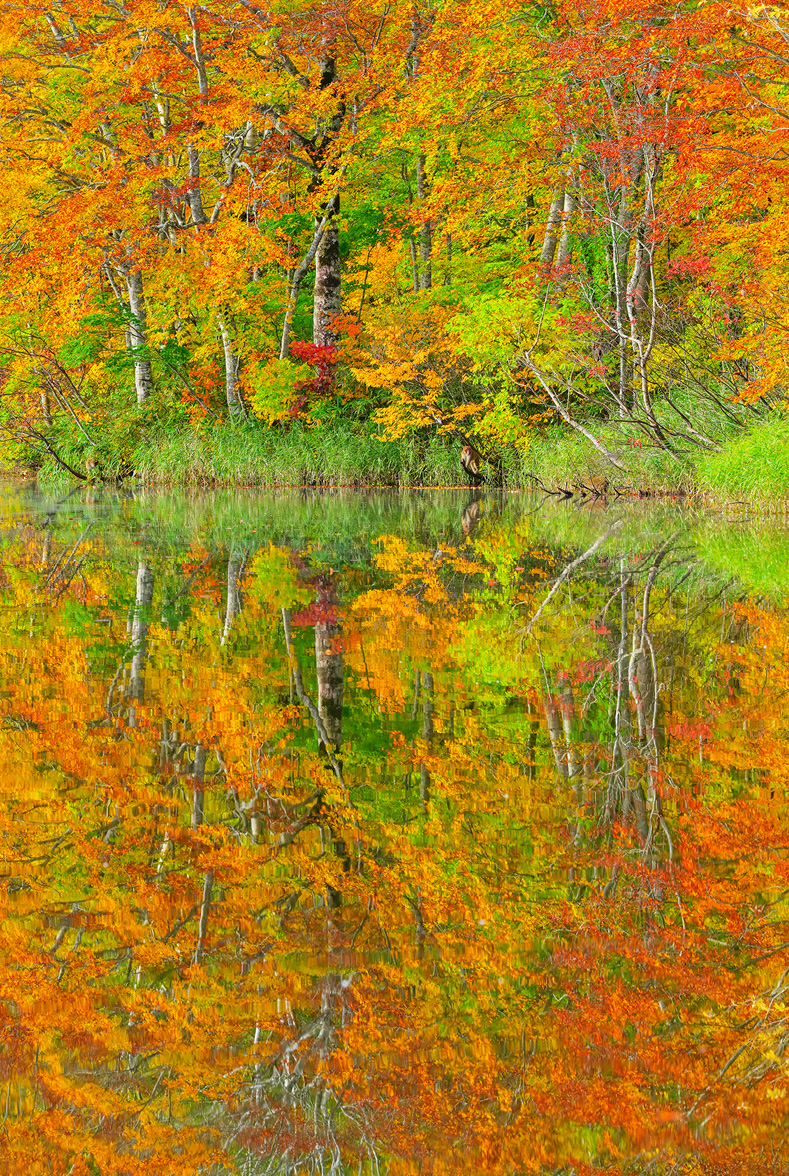 ガサガサガサ……艶やかな紅葉が水鏡に映り込む静かな朝。対岸の葉擦れの音がする辺りに目をやると、何かが動く気配がしてドキリとする。望遠レンズをのぞいてみると、水辺に現れたサルだった。パキパキパキ。木枝を渡るサルもいる。