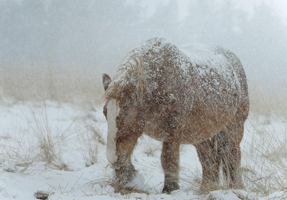 長岡賞に輝いた、第3部ネイチャーの「アタカの冬」瓜田英司さんの作品は、厳冬の青森県下北半島にあるアタカ放牧場の寒立馬を撮影している4枚組です。一枚一枚の作品の完成度もさることながら、組み方の巧みさにより、降りしきる雪の中の寒立馬の姿が痛々しくも美しく、その存在感を際立たせています。詩情豊かな表現から、寒立馬を愛おしく想う瓜田さんの気持ちが強く伝わってきて、とても好感が持てました。