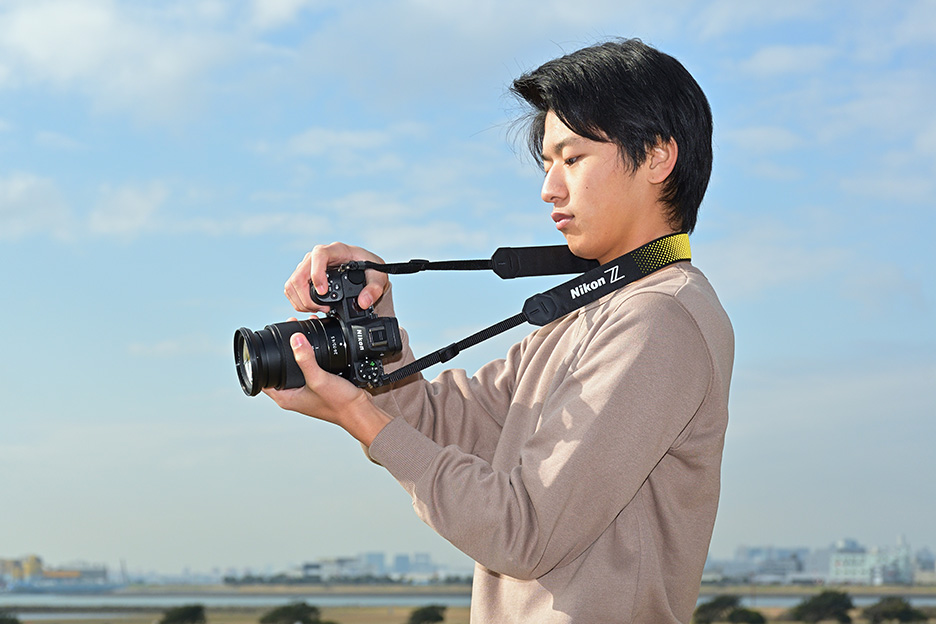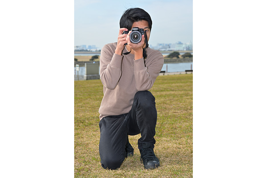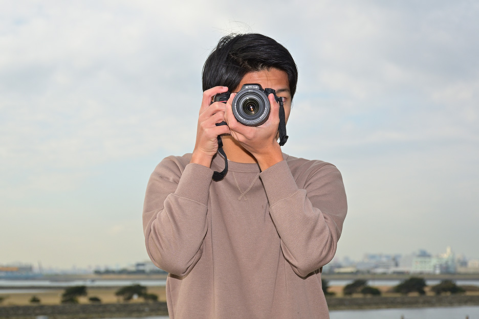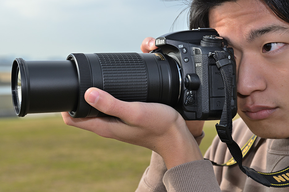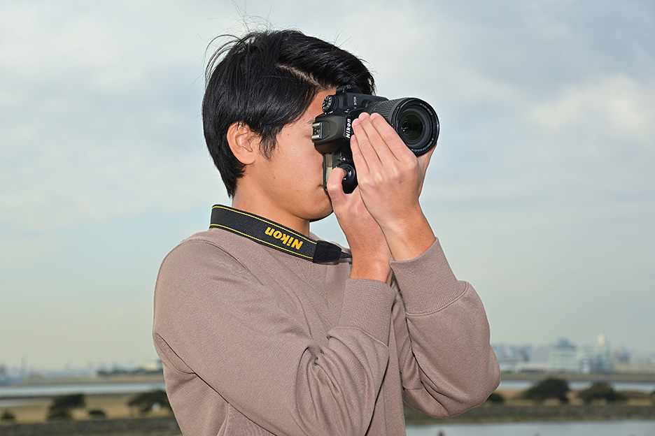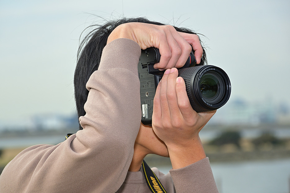 大きくて長いレンズを付けたカメラは重みも増し、重心も変わってきます。レンズが前のめりにならないように、左手のひらを広げ、レンズ全体をしっかり支えるようにします。また、バランス良くカメラを構えられるよう、レンズを支える手の位置を変えて調整してみましょう。