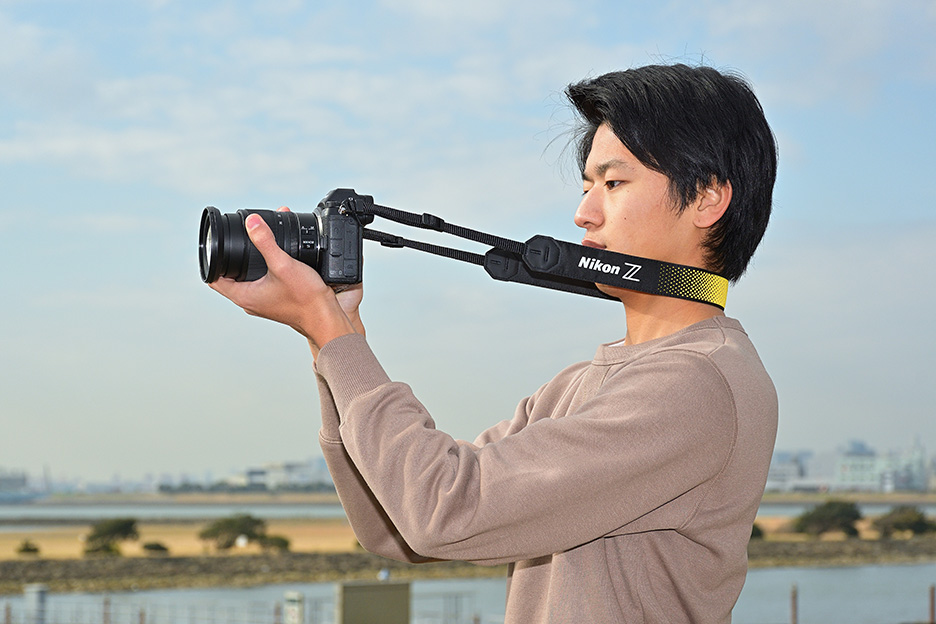 グリップを握った右手を上にし、左手はレンズとボディを下から支えます。縦位置の時もストラップを張らせるとぶれにくくなります。