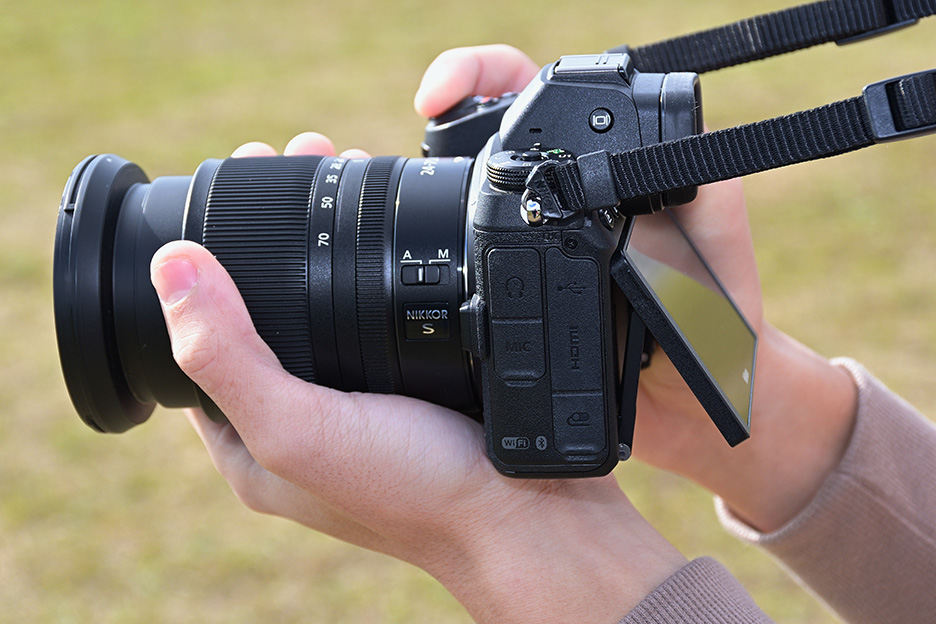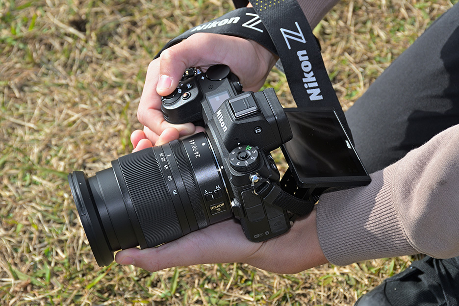 可動式モニターをに下に向け、カメラを高く持ち上げて撮影します。左手はレンズを握るようにして持つと安定します。ストラップが邪魔になる時には、右の手首に巻き付けるといいでしょう。