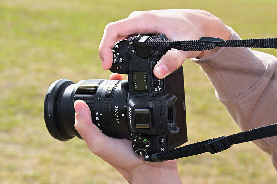 液晶モニターが見やすい位置までカメラを顔から離して撮影します。左手を揺らさないようにしてしっかり下から支えることがポイントです。この時にストラップをピンと張らせて構えれば、ブレを防ぐことができます。液晶モニターが見づらい位置で撮影したい場合、可動式液晶モニターであれば見やすい角度に調整します。