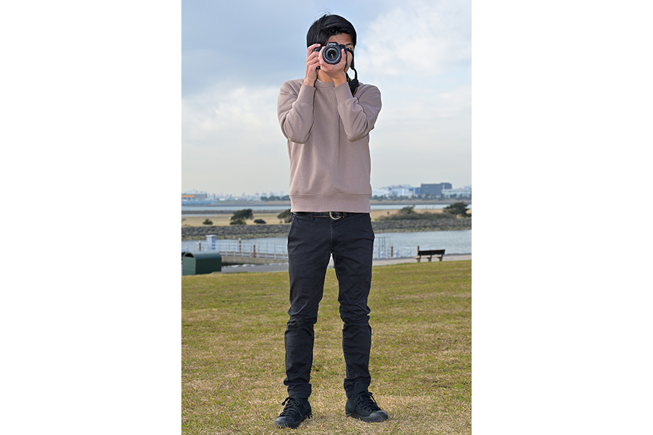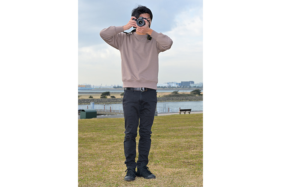 カメラを安定させて構えるには、立ちかたも重要です。脚は肩幅程度に開いて、上半身が揺れない姿勢をとるようにしましょう。