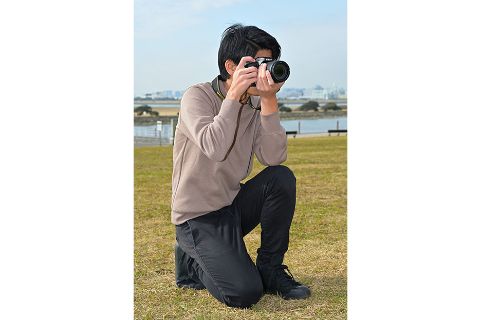 ファインダー撮影では、カメラの位置に姿勢を合わせます。低い位置で撮る場合は立膝になって、肘を膝の上につくことで上半身を安定させることができます。