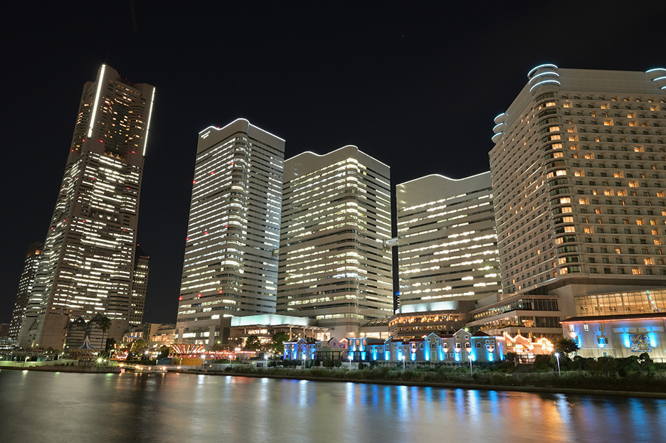 今度は屋外で蛍光灯のついたビル群を撮影してみます。