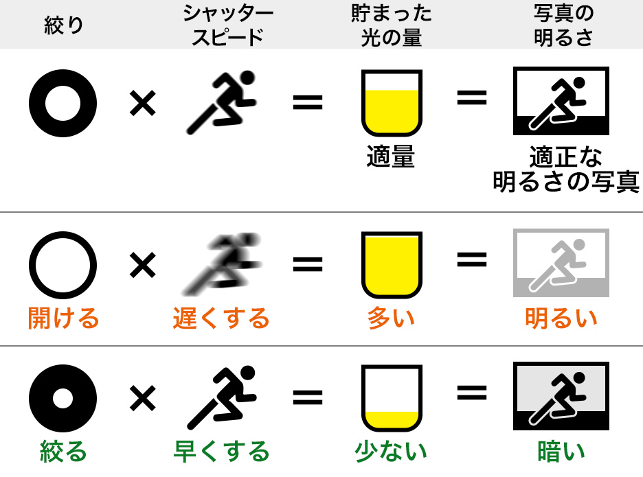 写真は、光の量が多すぎても少なすぎてもうまく写りません。撮影状況に応じた適正な光の量をレンズから取り込むことで(適正露出)、適正な明るさの写真を撮ることができます。