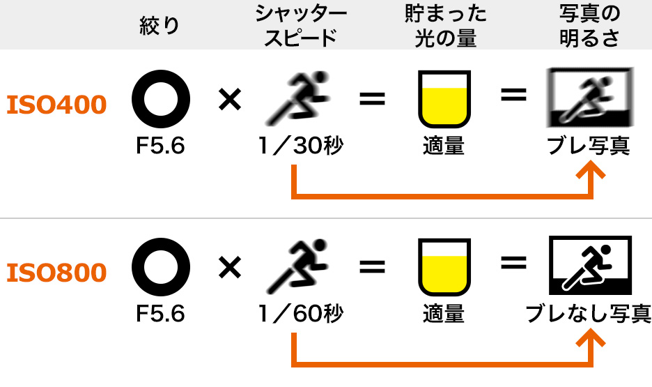 よく室内や夜間などのシーンで「シャッタースピードが遅く手ブレする場合は、ISO感度を上げるとよい」といわれるのはこのためです。