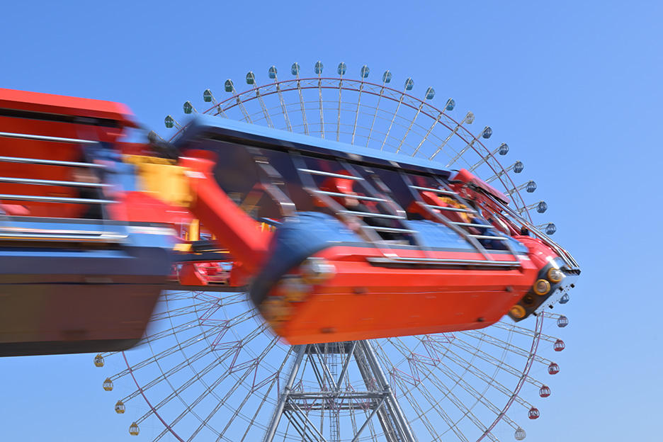 遊園地にある、動きの速いアトラクションを撮影したものです。速く動く被写体をブラさず止めて撮影したい場合には、シャッタースピードも速くなければなりません。この写真の場合、背景に写っている観覧車もボカさずはっきり写したかったため絞りをf/14まで絞っており、晴天で光量があるシチュエーションでもISO 100ではシャッタースピードが1/80秒になってしまいました。