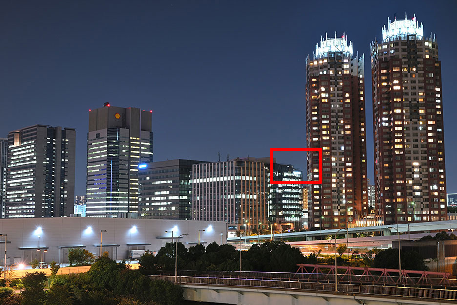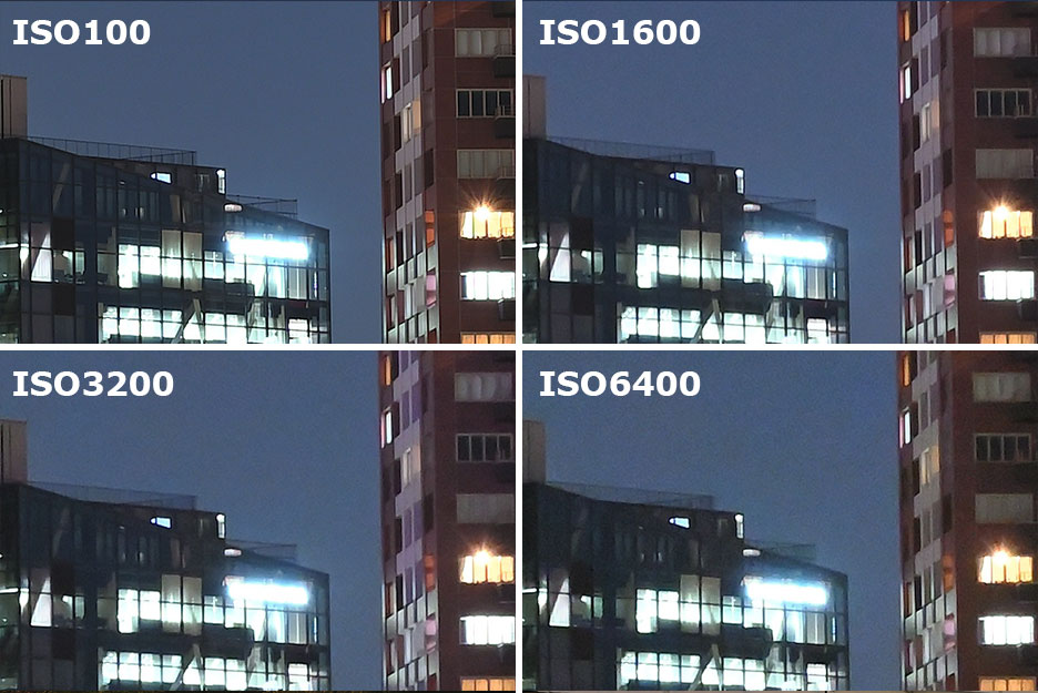 夜景を手持ちで撮影したとき、ISO感度が100ではシャッタースピードが1/1.3秒まで遅くなってしまい手ブレしていますが、ISO 6400まで上げることで1/80秒までシャッタースピードが速くなり、手ブレをふせぐことができました。
