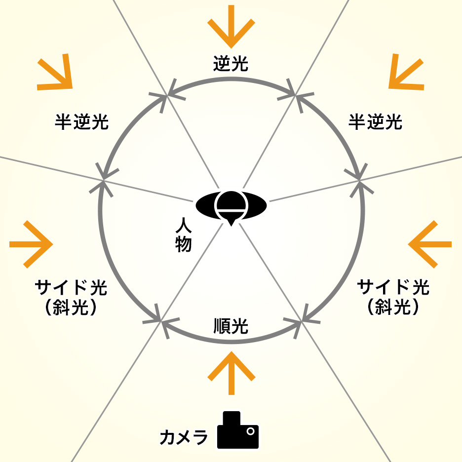 光の方向にはどんなバリエーションがあるのでしょう。被写体とカメラ、そして光の方向の関係性を表した図で確認してみましょう。