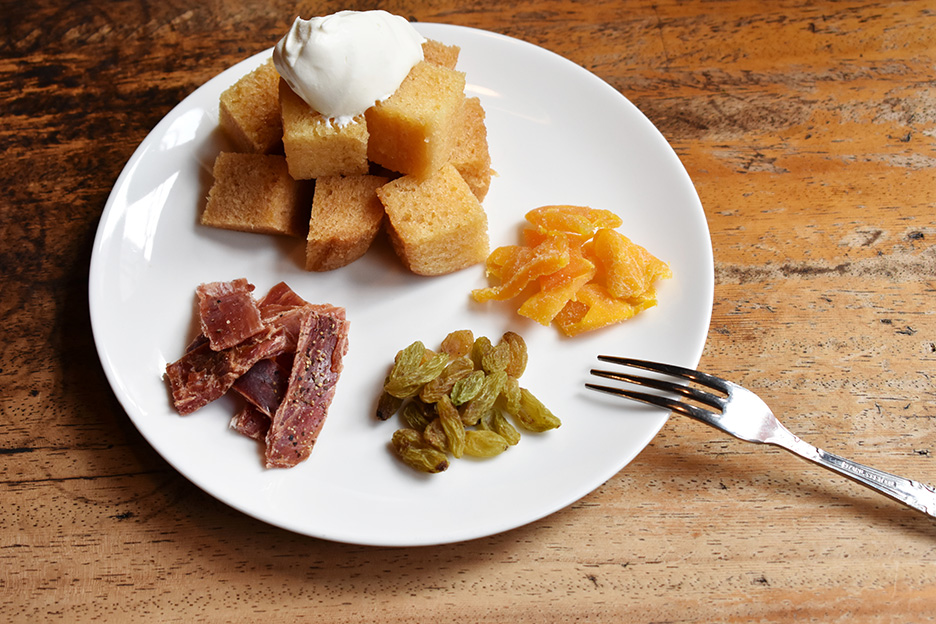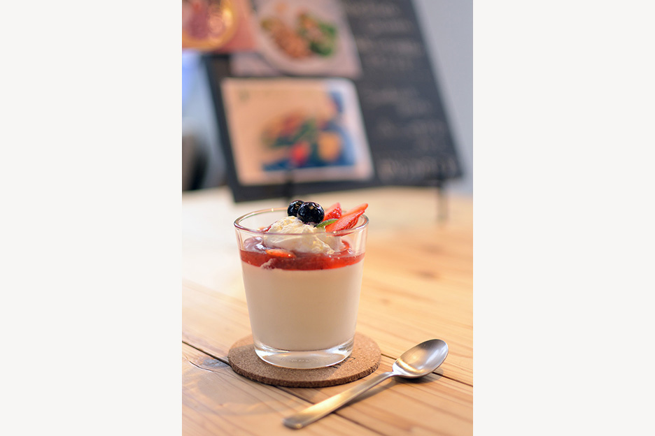 2つの光を活かし撮影。窓からの光が強く当たりすぎないよう逆光で、デザートが暗くなりすぎないよう露出を上げて撮影しています。上からの照明でフルーツに照りが出て、おいしそうに写りました