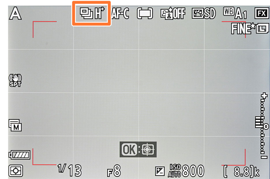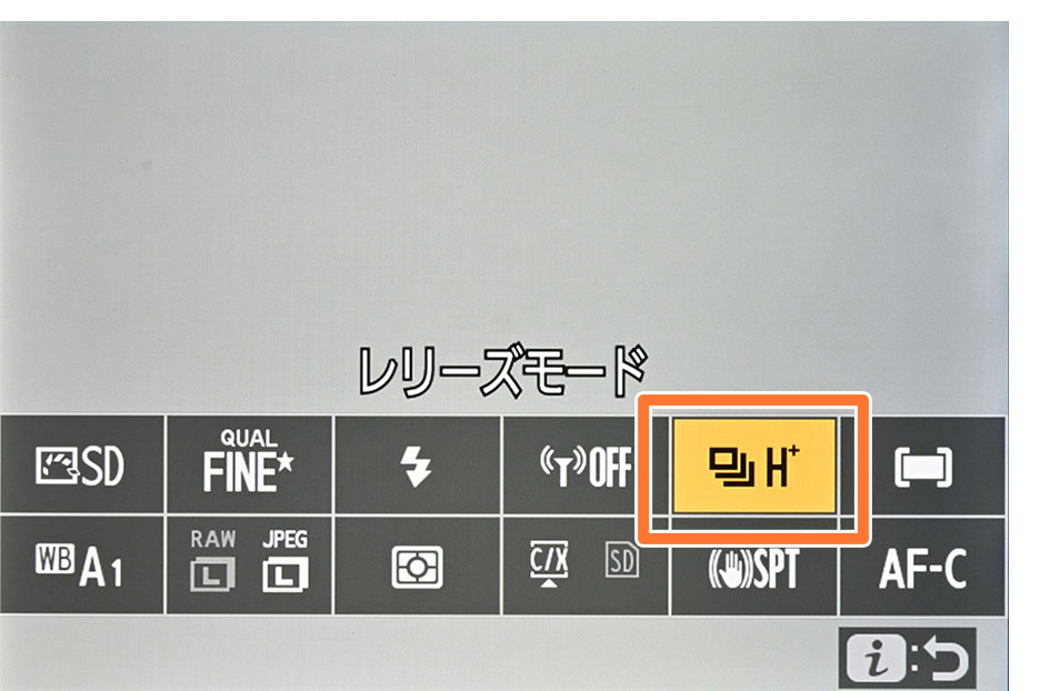 画像モニターでは枠で示した箇所に選んだレリーズモードが表示されます