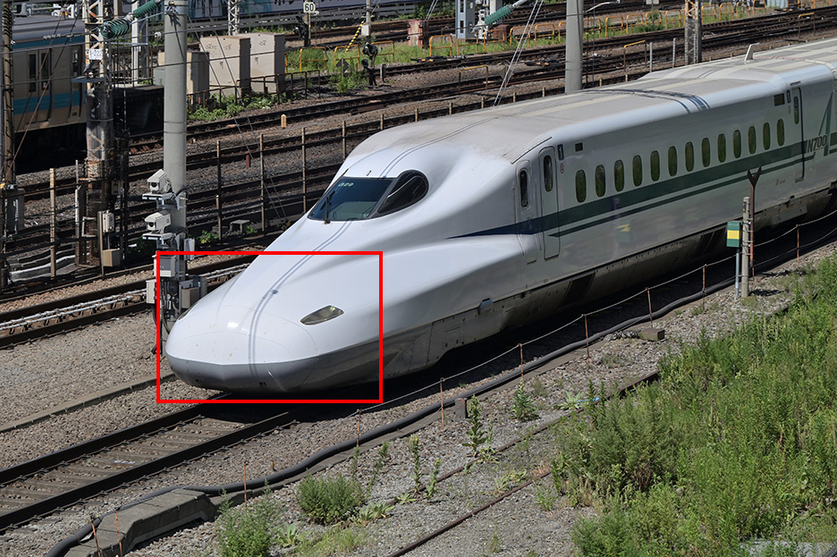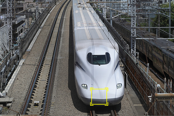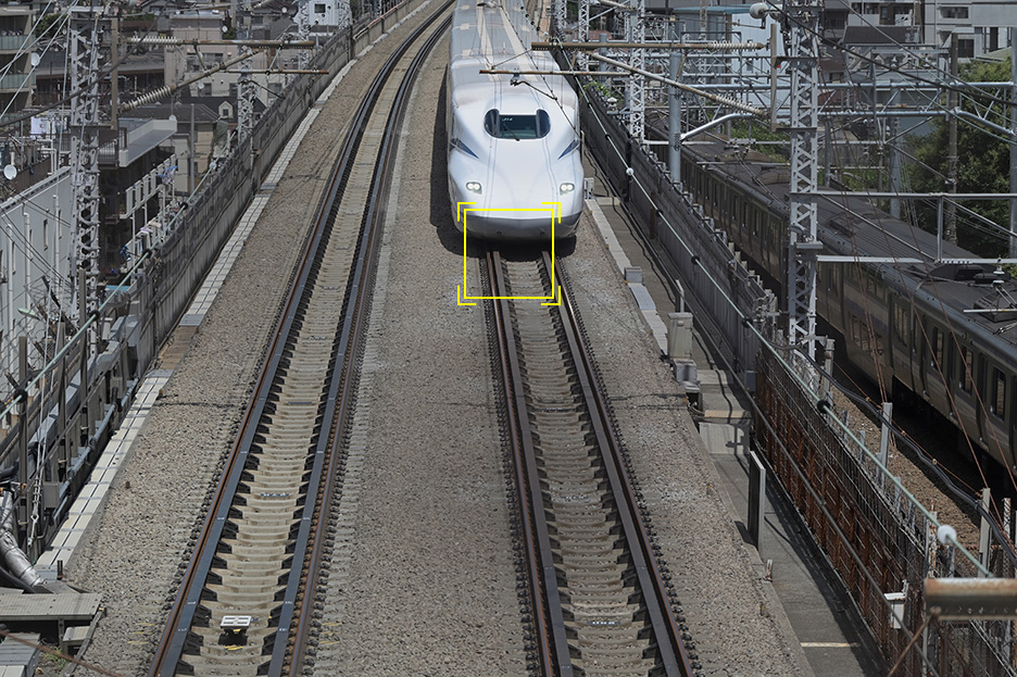 新幹線が来たタイミングでシャッターボタンを半押しすると、フォーカスポイントの形が変わり新幹線の追尾を開始します