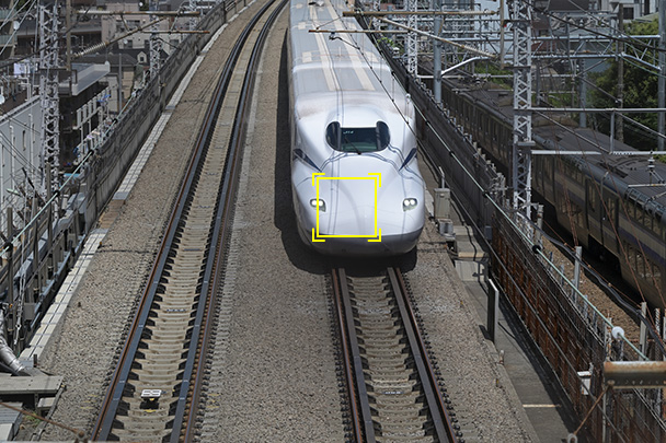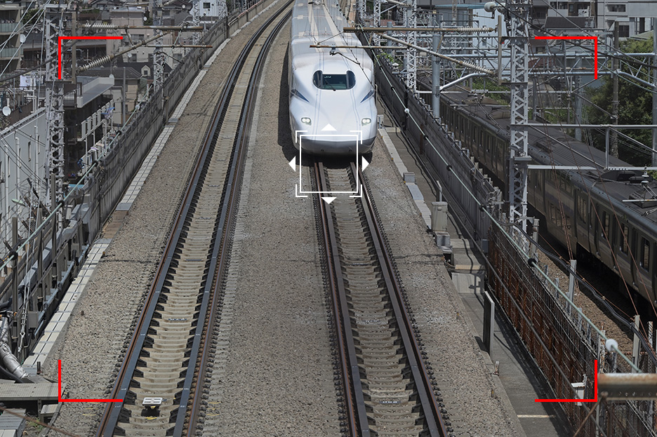 奥から手前に走ってくる新幹線を狙ってみましょう。[オートエリアAF]に設定後、OKボタンを押すとターゲット選択画面になります。その状態で、フォーカスポイントを線路の奥の方に置いておきます