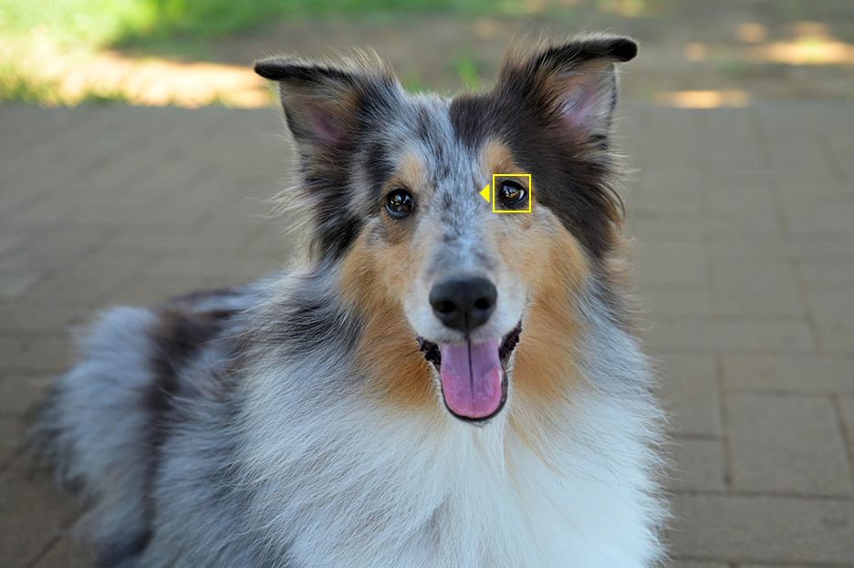 カメラが動物の顔を認識すると顔(瞳)部分に黄色の枠(フォーカスポイント)が表示されます。瞳を認識できるときは、左右どちらかの瞳に黄色のフォーカスポイントが表示されます。