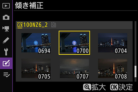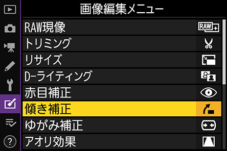 [画像編集メニュー]から[傾き補正]を選択。マルチセレクターの▶を押します