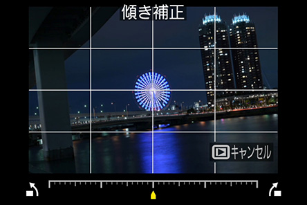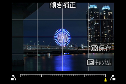 マルチセレクターの◀▶で、傾きを調整します。OKボタンを押すと、修正した状態の画像が新しいファイルとしてメモリーカードに保存されます