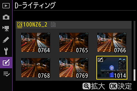 同じように[画像編集メニュー]から[D-ライティング]の画像選択画面を表示させ、先ほど保存した“傾き補正をかけた画像”を選択し、OKボタンを押します
