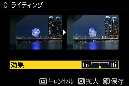 [D-ライティング]の編集画面が表示されたら、マルチセレクターの◀▶で、効果の効き具合を選択。OKボタンを押し、保存します