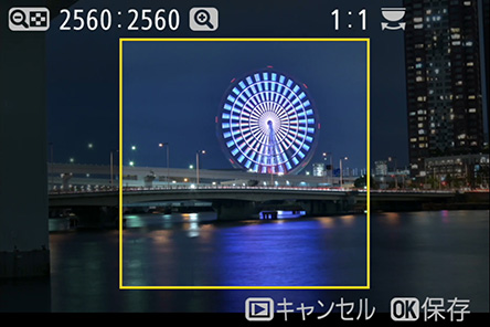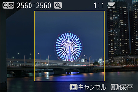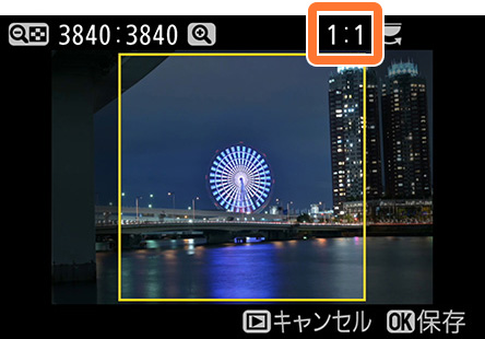 メインコマンドダイヤルを回しながら、切り抜く範囲のアスペクト比(縦横比)を変更します。今回は、1:1を選びました
