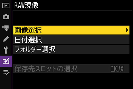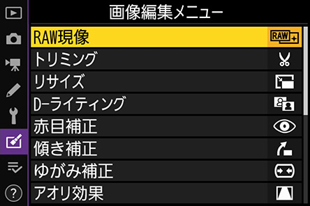 RAW形式で撮影した画像は[画像編集メニュー]の一番上、[RAW現像]から現像することができます