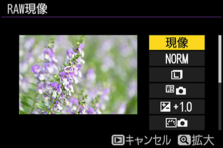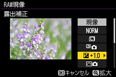 今回は、[露出補正]のみ設定変更をかけ現像しましょう。一番上の[現像]を選びマルチセレクターの▶を押すと、修正された状態の画像が新しいJPEG画像としてメモリーカードに保存されます
