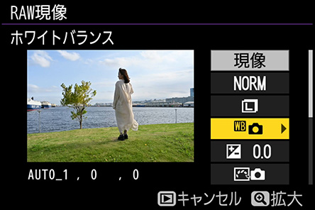 [画像編集メニュー]→[RAW現像]から[ホワイトバランス]を選択、マルチセレクターの▶を押します
