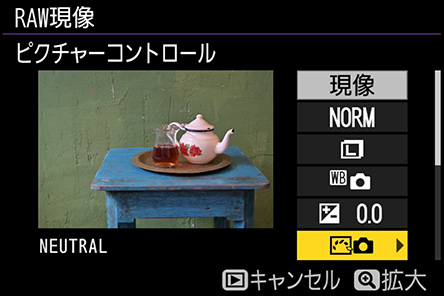 [画像編集メニュー]→[RAW現像]から[ピクチャーコントロール]を選択、マルチセレクターの▶を押します