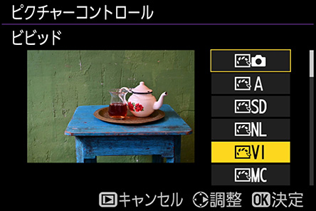 [ピクチャーコントロール]の編集画面から、変更したいモードを選択、それぞれ色の濃さやコントラスト、輪郭強調の効果を調整することができます。OKボタンを押して設定を保存します。